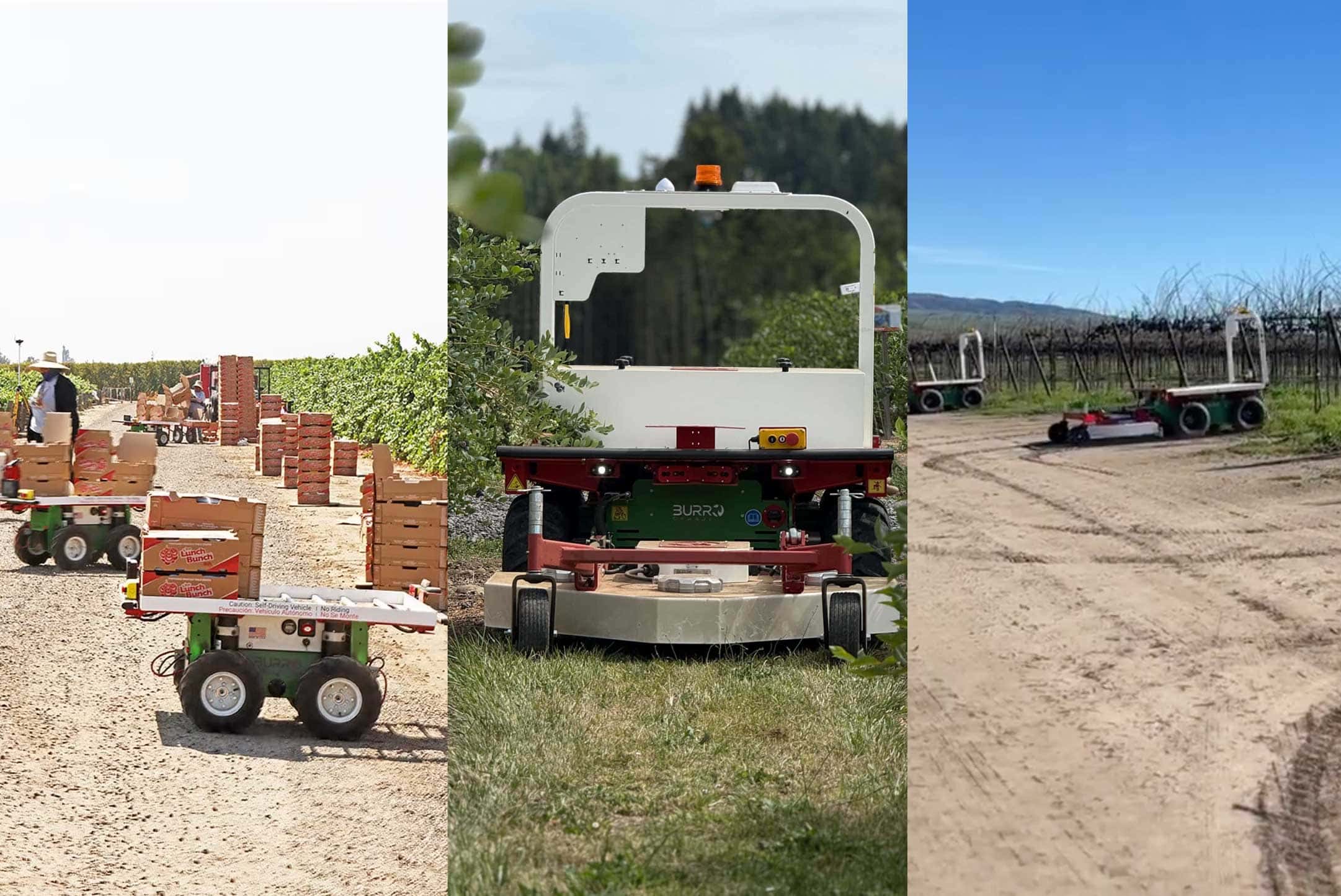Burros can be used in permanent crops as a Harvest Assist vehicle, helping reduce labor by automating logistics for 4 to 8 person teams per Burro in crops like table grapes, blueberries, raspberries, blackberries, and citrus. Customers today are also using Burros to autonomously patrol, & spray.